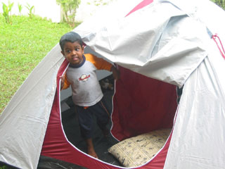 Since I now sleep with Mummy and Sarah, I woke up and was taken to my room where I found my presents waiting for me. I got a nice Dinosaur Book with Jigsaws and a Lego animal set from Mummy and Daddy. I also got a stuffed Elephant from Sarah! There was a 'long box' present which turned out to be a tent from Appu and Appachi. I was so excited.