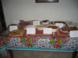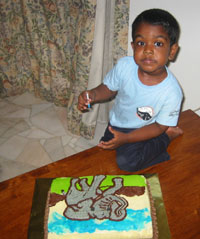 Since I now sleep with Mummy and Sarah, I woke up and was taken to my room where I found my presents waiting for me. I got a nice Dinosaur Book with Jigsaws and a Lego animal set from Mummy and Daddy. I also got a stuffed Elephant from Sarah! There was a 'long box' present which turned out to be a tent from Appu and Appachi. I was so excited.
